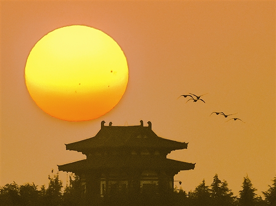 11月18日,一群白天鵝在三門峽天鵝湖國家城市濕地公園的落日余暉中展翅翱翔。隨著冬季到來,從西伯利亞及蒙古國飛來我市黃河濕地越冬的白天鵝逐日增多。 杜杰 攝