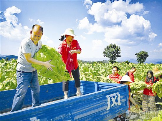 圖為包扶干部趁著晴好天氣幫助貧困戶采收煙葉。 張雨義 攝