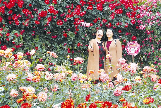 ![]() 5月6日,游客在市區(qū)澗河公園月季園欣賞月季花。