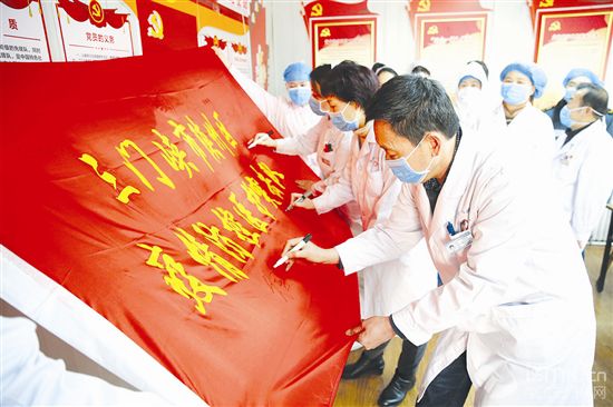 2月4日,陜州區(qū)人民醫(yī)院的醫(yī)護(hù)人員在區(qū)疫情防控突擊隊(duì)隊(duì)旗上簽字,決心到新型冠狀病毒感染的肺炎疫情最需要的地方履職盡責(zé)。