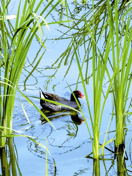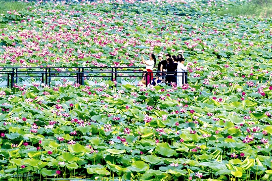 6月27日,天鵝湖國家城市濕地公園300多畝荷花進入盛花期,黑水雞(紅骨頂)及幼鳥、斑嘴鴨、白鷺、蒼鷺等幾十種鳥類在荷塘里嬉戲、覓食,給夏日的荷塘增添了靈氣,也吸引了眾多游人觀賞拍照。 本報記者 杜杰 攝